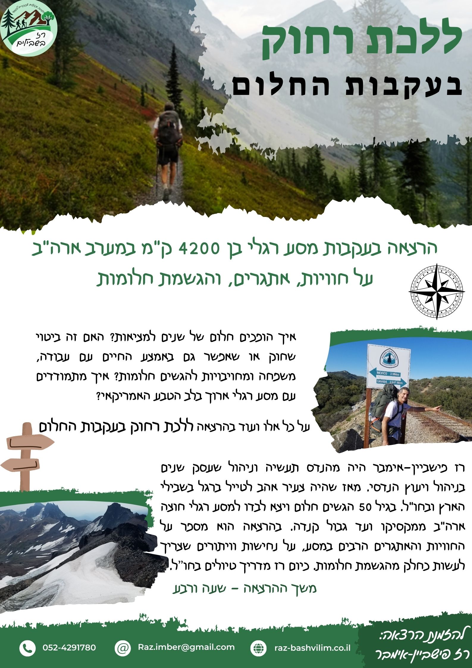 בשנת 2021 ערכתי מסע רגלי ארוך בשביל ה- Pacific Crest Trail במערב ארה"ב מגבול מקסיקו ועד קנדה. היציאה למסע וההתנהלות בו לוותה בדילמות רבות ואתגרים. אני מקיים הרצאות המתארות את המסע, האתגרים, הנופים, הרגעים המצחיקים, התובנות שהתגבשו ומנסה לברר את השאלה "למה לעשות כאלה דברים משוגעים (ובגיל 50...) ?". ההרצאה מתאימה לגילאי +-15 ומעלה.